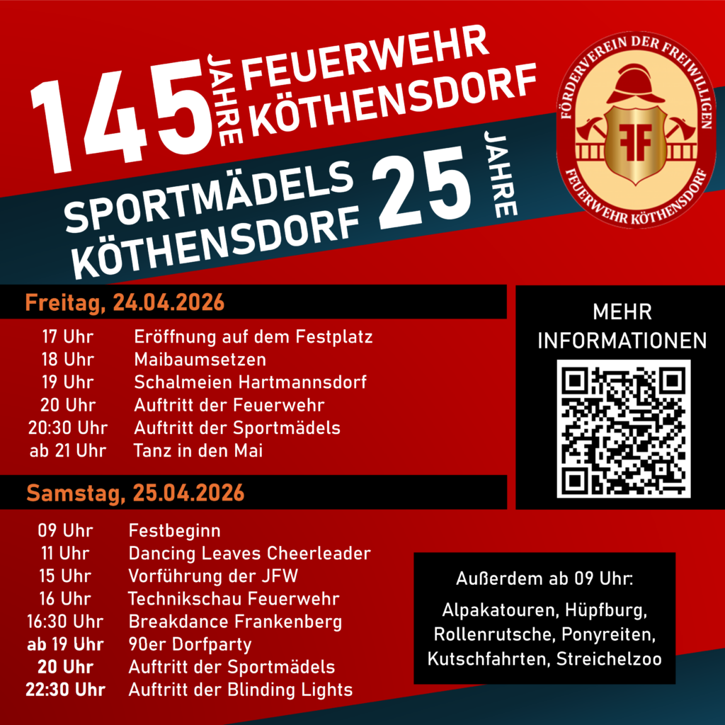 Köthensdorf macht sich bereit für das Event des Jahres! Am 24. und 25. April 2026 verwandelt sich das Gelände der Schulstraße 3 in eine unser Festgelände.