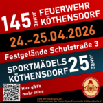 Großes Jubiläumswochenende in Köthensdorf: Wir feiern 145 Jahre Feuerwehr & 25 Jahre Sportmädels & 10 Jahre Förderverein der FFW Köthensdorf!Köthensdorf macht sich bereit für das Event des Jahres! Am 24. und 25. April 2026 verwandelt sich das Gelände der Schulstraße 3 in eine unser Festgelände. Wir laden euch herzlich ein, gemeinsam mit uns drei Jubiläen zu … 145 Jahre Feuerwehr & 25 Jahre Sportmädels & 10 Jahre Förderverein der Feuerwehr Köthensdorf weiterlesen - Pyramiedenanschieben 2026Hier kommen bald mehr Informationen. Wir freuen uns am 30.11.2025 euch Begrüßen zu dürfen.