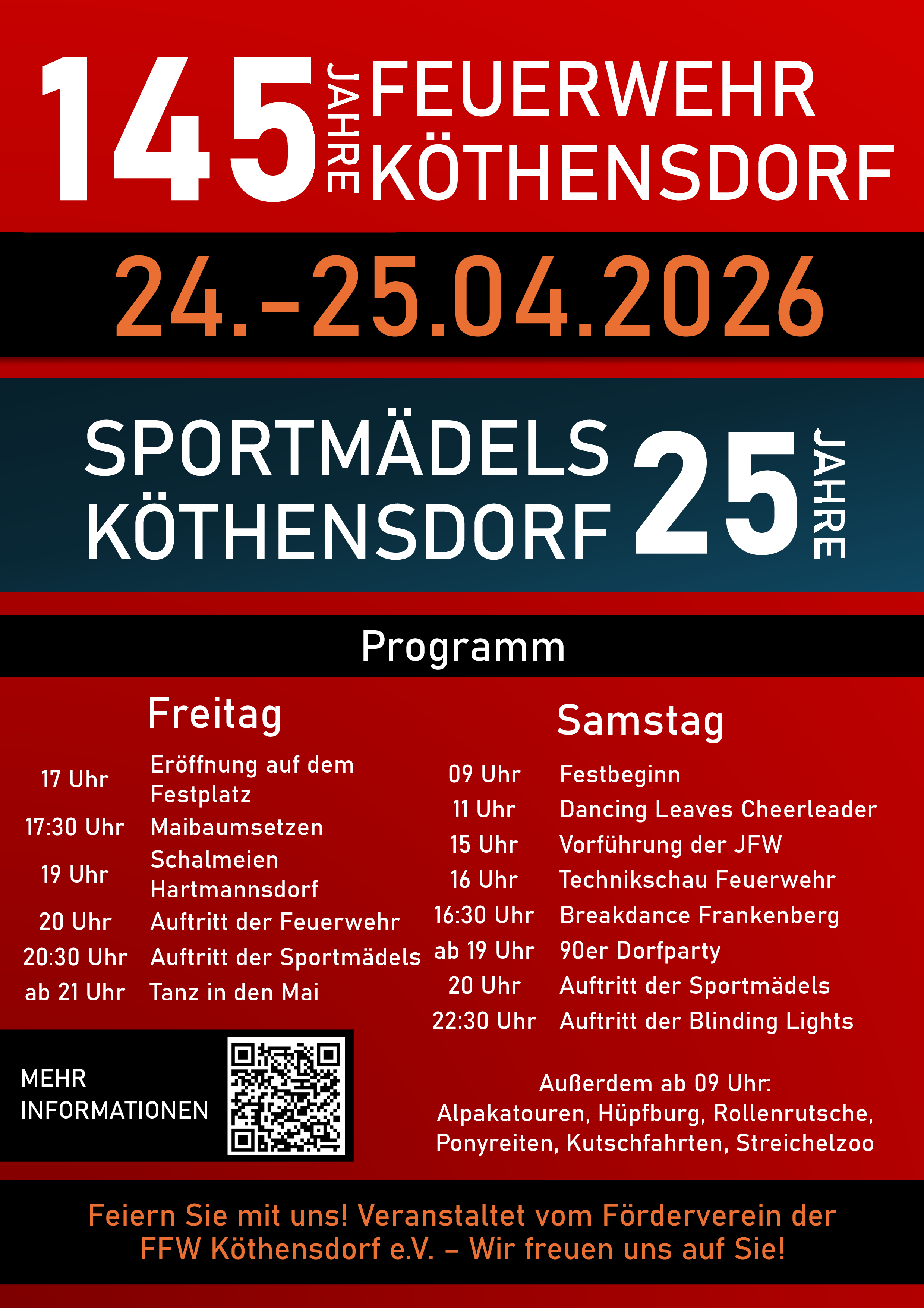 Köthensdorf macht sich bereit für das Event des Jahres! Am 24. und 25. April 2026 verwandelt sich das Gelände der Schulstraße 3 in eine unser Festgelände.